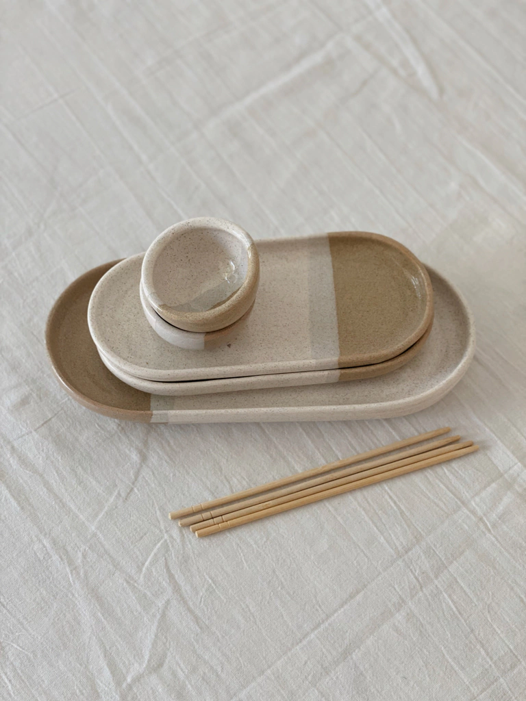 Set de sushi de cerámica - Plato ovalado + pocillo para salsa de soja