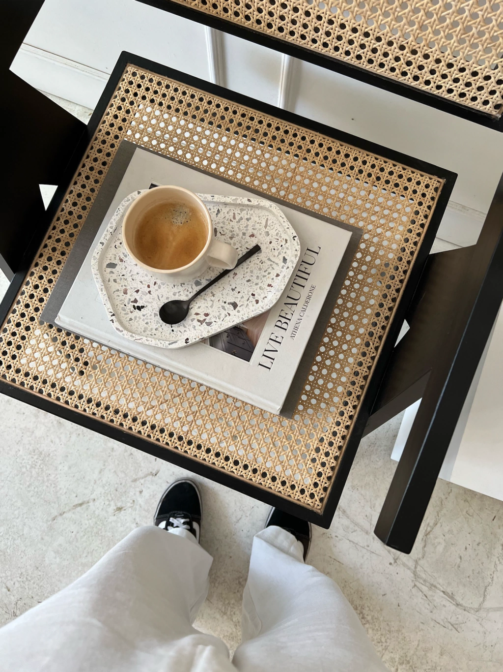 Silla de madera laqueada con esterilla francesa en asiento y respaldo.